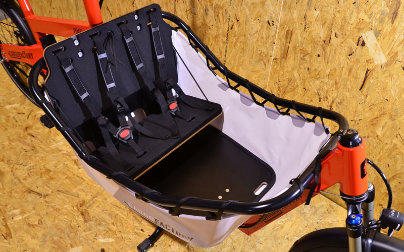Optional mit klappbarer 2er Sitzbank, in Verbindung mit unseren hochwertigen & funktionalen Y-Gurten, die wohl beste Kindersitzlösung die derzeit im Cargobereich erhältlich ist.